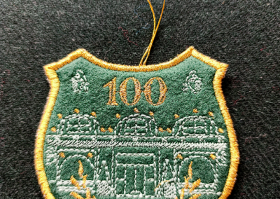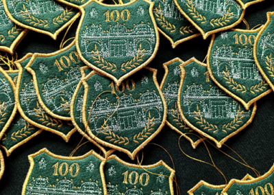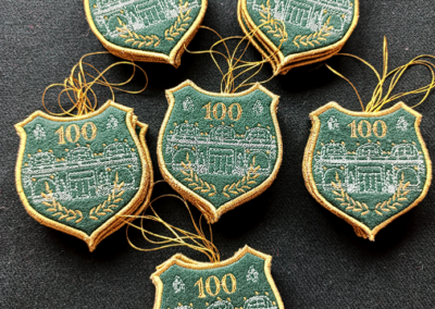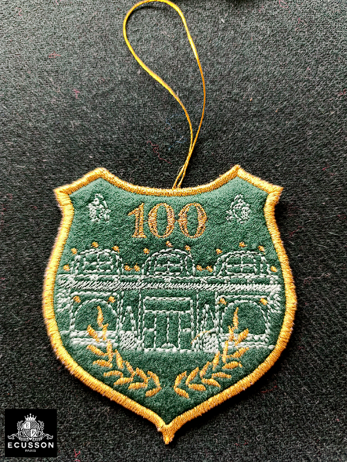 SUR FOND VERT PROFOND, LA BRODERIE RÉVÈLE DES FILS DORÉS FINEMENT TRAVAILLÉS, DESSINANT LE CHIFFRE « 100 » EN HOMMAGE À UN SIÈCLE D’EXCELLENCE HÔTELIÈRE. AU CŒUR DU BLASON, UN BÂTIMENT EMBLÉMATIQUE AUX DÔMES RAFFINÉS ÉVOQUE L’ARCHITECTURE HISTORIQUE DU BRISTOL, TANDIS QUE DES MOTIFS SYMBOLIQUES ET DES BRANCHES DE LAURIER DORÉES ENCADRENT L’ENSEMBLE AVEC NOBLESSE.